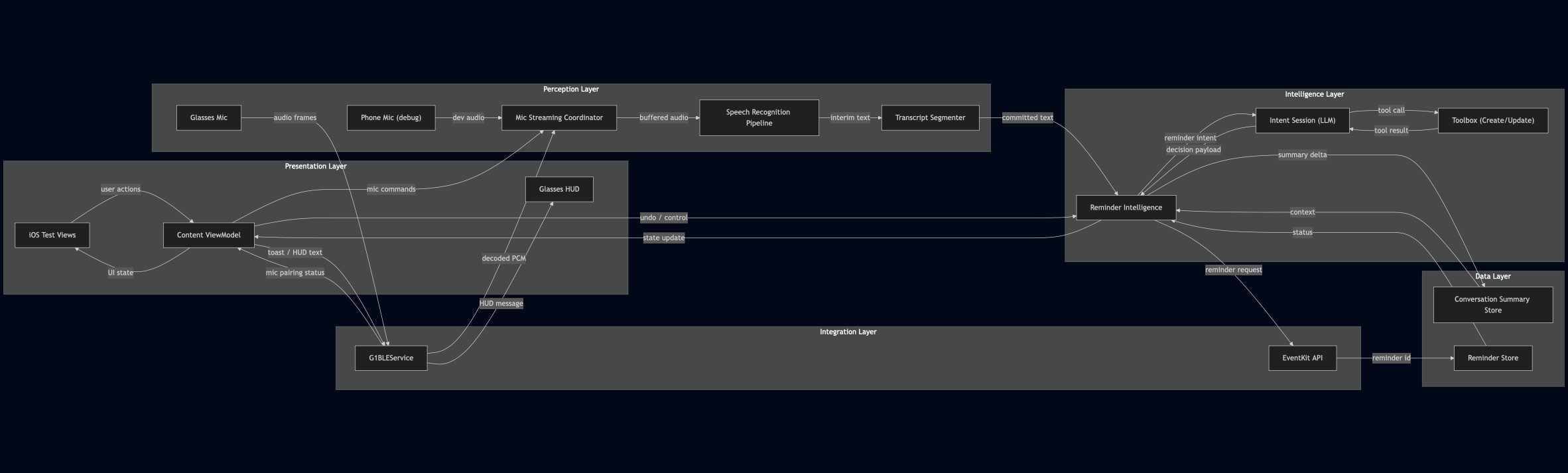 So I built a fun project: a context-aware reminder agent for smart glasses. It worked across three layers: a perception layer (streaming audio, detecting speech, transcribing), an intelligence layer (an on-device LLM that extracts follow-up intent), and a data layer (context and reminder storage).