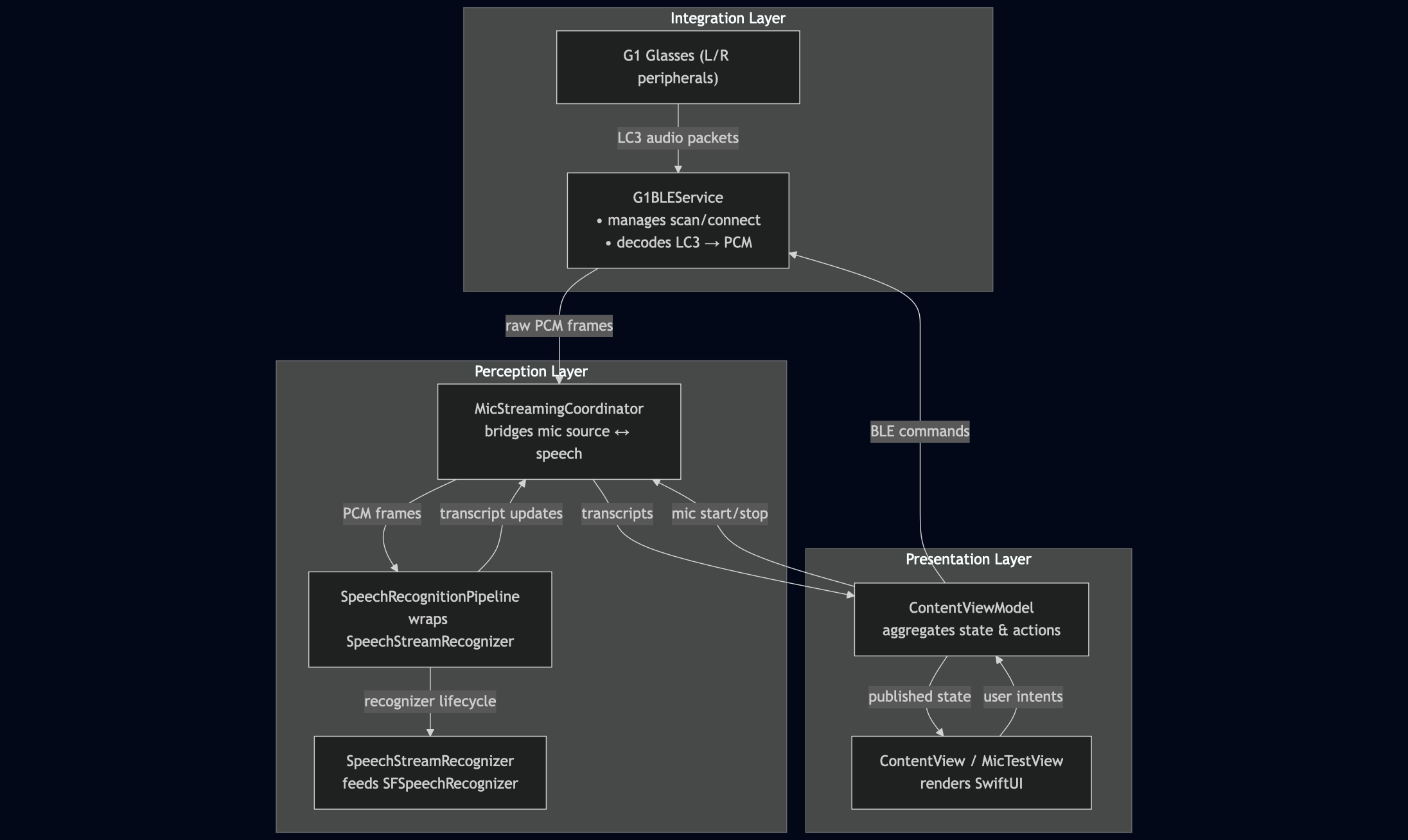 + ViewModel: a dedicated playground to watch everything in action — mic controls, live transcript, committed segments, extractor status, debug summaries. This testbed has been invaluable for tuning thresholds and catching weird behaviors before shipping anything into the actual glasses UI.