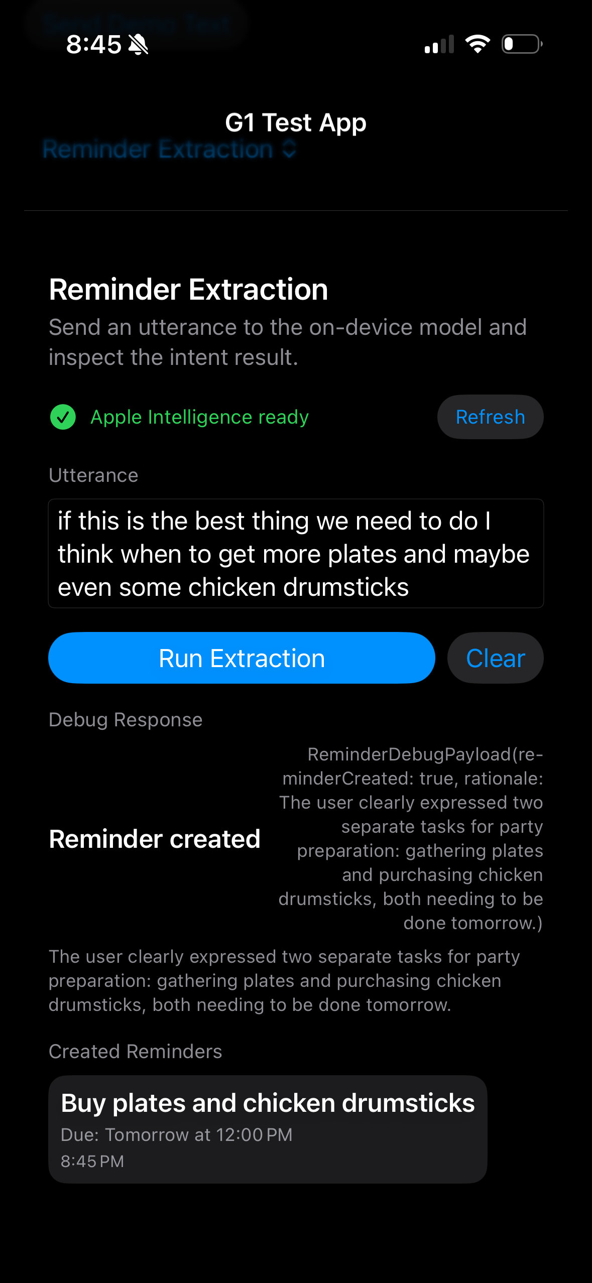 To keep things extendable, I modeled reminder creation as a “tool.” Right now the tool doesn’t do much, it just invokes a callback that updates the text on the glasses display. The idea is that the model decides when to call it, and later I can plug in real storage or notifications behind the same interface without changing the upstream logic.