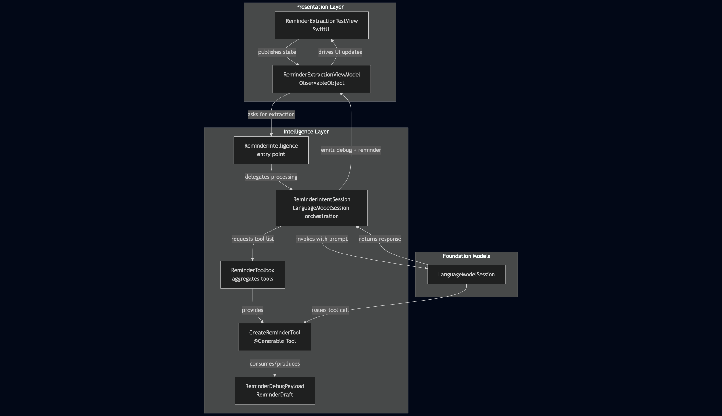 In June 2025, Apple dropped the Foundation Models SDK — a neat little API that lets developers call Apple’s on-device models directly. The default option is a ~3B parameter model. Small by today’s standards, but fast, private, and (supposedly) good enough for lightweight tasks. The question I had was: can it actually handle extracting reminders from natural conversation?