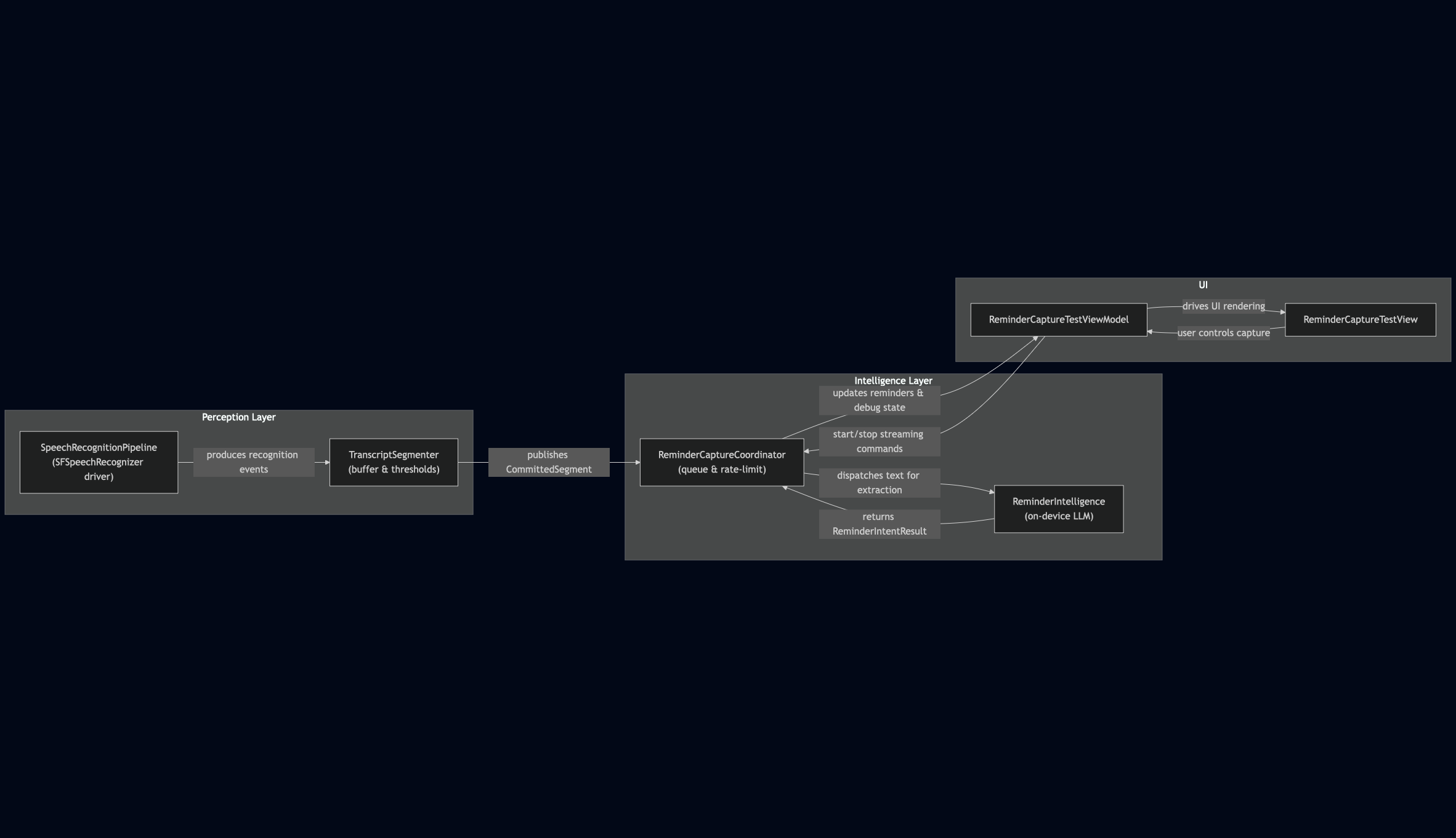 (perception layer): a formatted-string buffer with guardrails. Tracks elapsed time and character count, emits a CommittedSegment when thresholds are hit or text backtracks.ReminderCaptureCoordinator